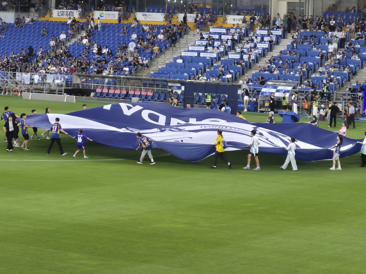 킥오프 직전, 울산 HD FC의 상징인 대형 깃발 퍼포먼스가 펼쳐졌습니다. 관중석에서 함께 울려 퍼지는 응원가는 소름 돋을 정도로 웅장했습니다.