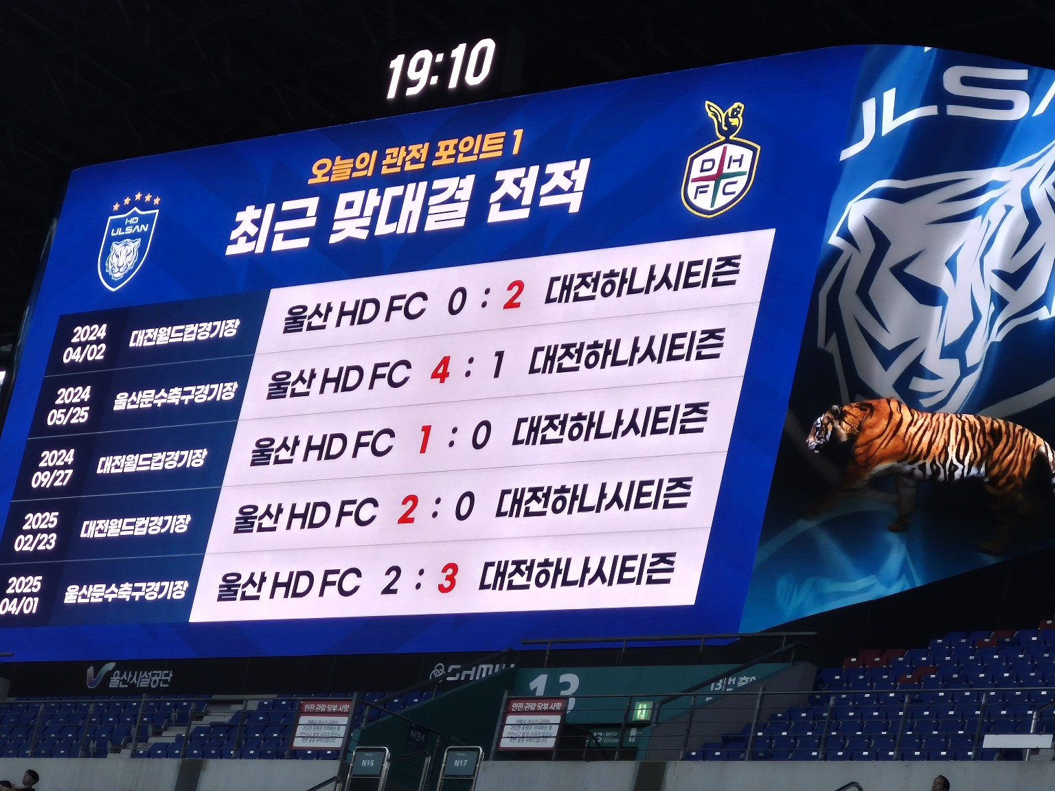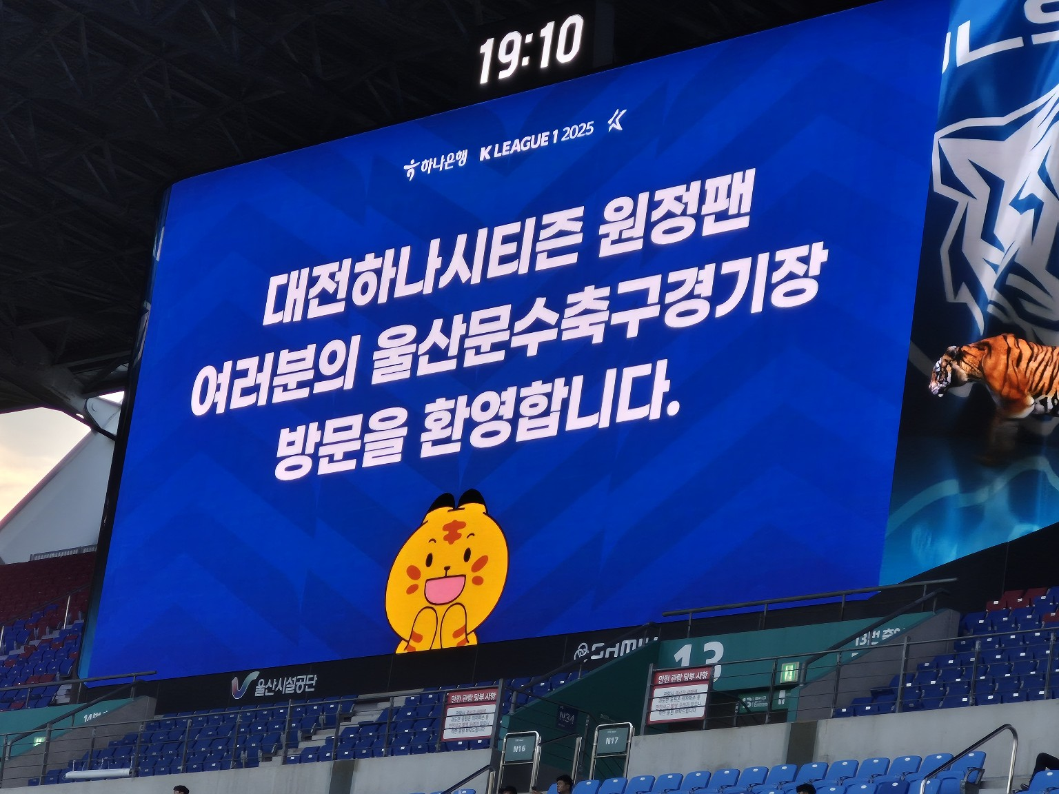 전광판에는 “대전하나시티즌 원정팬 여러분의 울산문수축구경기장 방문을 환영합니다”라는 메시지가 띄워졌습니다. 이런 스포츠맨십이 바로 K리그 현장의 매력 아닐까요?
