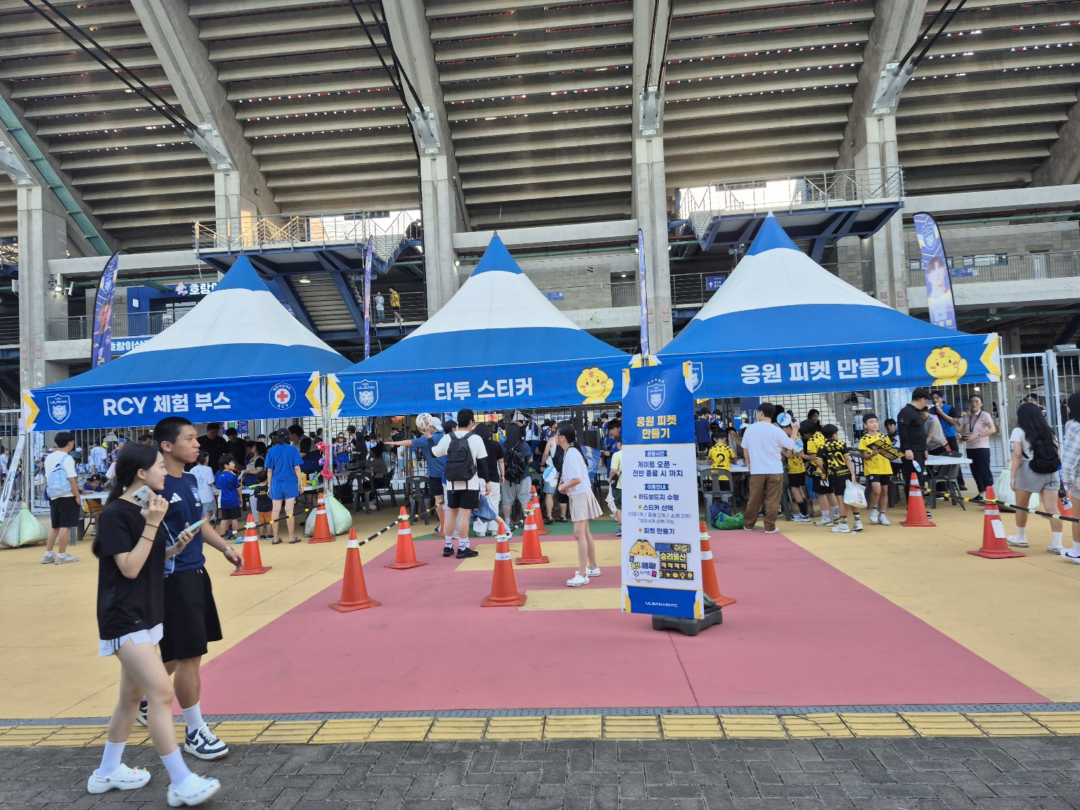 경기장 밖 광장은 이미 축제 현장이었습니다. RCY 체험 부스, 타투 스티커, 응원 피켓 만들기 등 다양한 이벤트가 진행되고 있었고, 가족 단위 관람객들이 줄을 서서 즐기는 모습이 인상적이었어요.