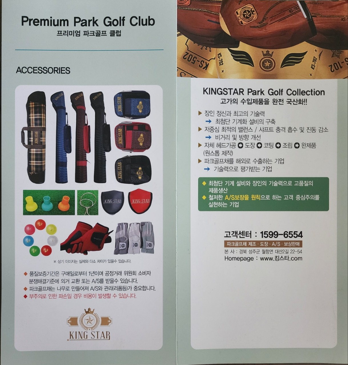 파크골프 용품 국내 자체 제작하는 제조사 킹스타 파크골프는 저중심 설계, 최적의 밸런스, 비거리 향상 및 방향 개선 디자인 부터 완제품까지 원스톱 제작으로 개인 피팅도 가능한 저희 킹스타와 함께하는 모든 시간이 즐겁고 의미있는 시간이 되시길 기원합니다.
